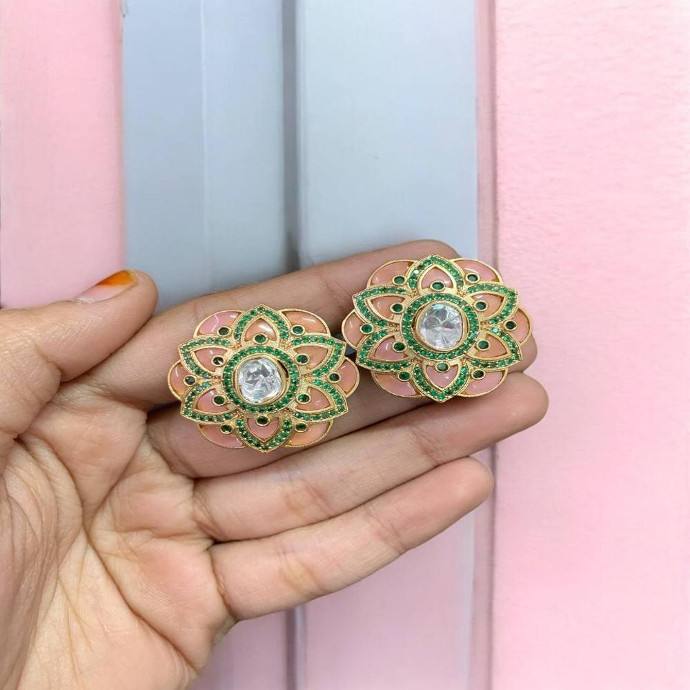 SIPL Design # EQ04237 Pair of intricately designed earrings with a floral motif. The earrings feature a lotus-like design with gold accents, pink stones, and a central moissanite polki. The outer petals are outlined with pink talaf work, and the overall design is symmetrical and elegant. The earrings have a traditional Indian jewelry style, combining jadai work and gemstone embellishments.